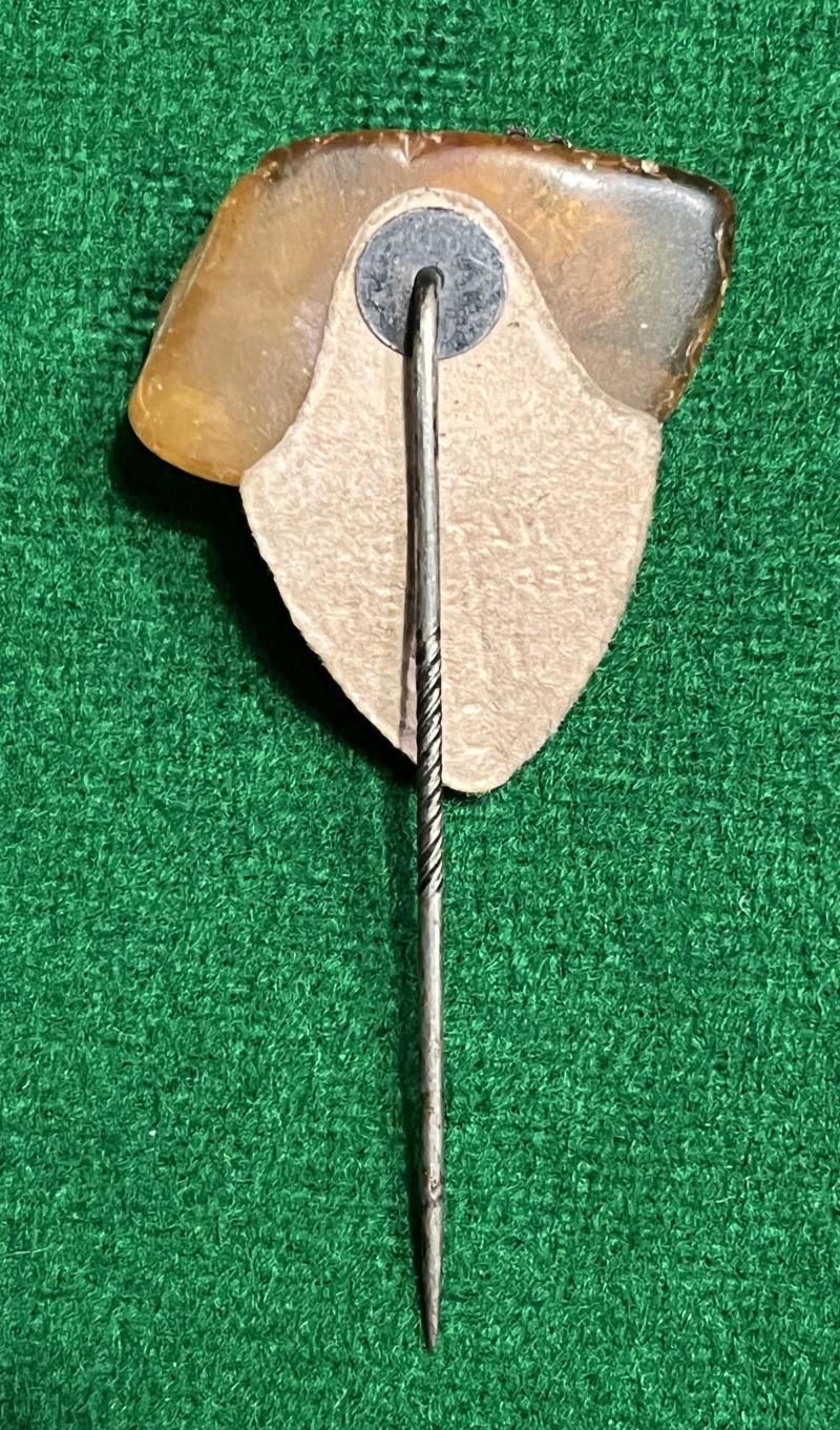 Amber type stone mounted on a stickpin with DAF and Workers insignia in gilt surmounting a paper shield with foil inscription ' Natur-Bernstein NBJ '. Thought to be a WHW campaign stickpin. POSTFREE within UK