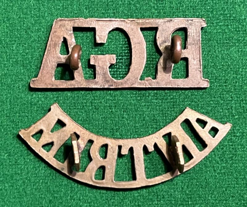 Scarce shoulder titles worn by the Antrim Militia Royal Garrison Artillery. Worn very briefly between 1907-08. Good, used condition with all lugs.