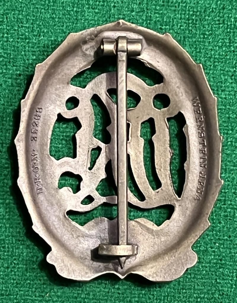 An good example of a bronze grade sports award issued by the Deutscher Reichsbund für Leibesübungen (DRL) the official Sports governing body of the Third Reich. Retaining much of it's original finish and manufacturer marked to the reverse ' Wernstein Jena '.