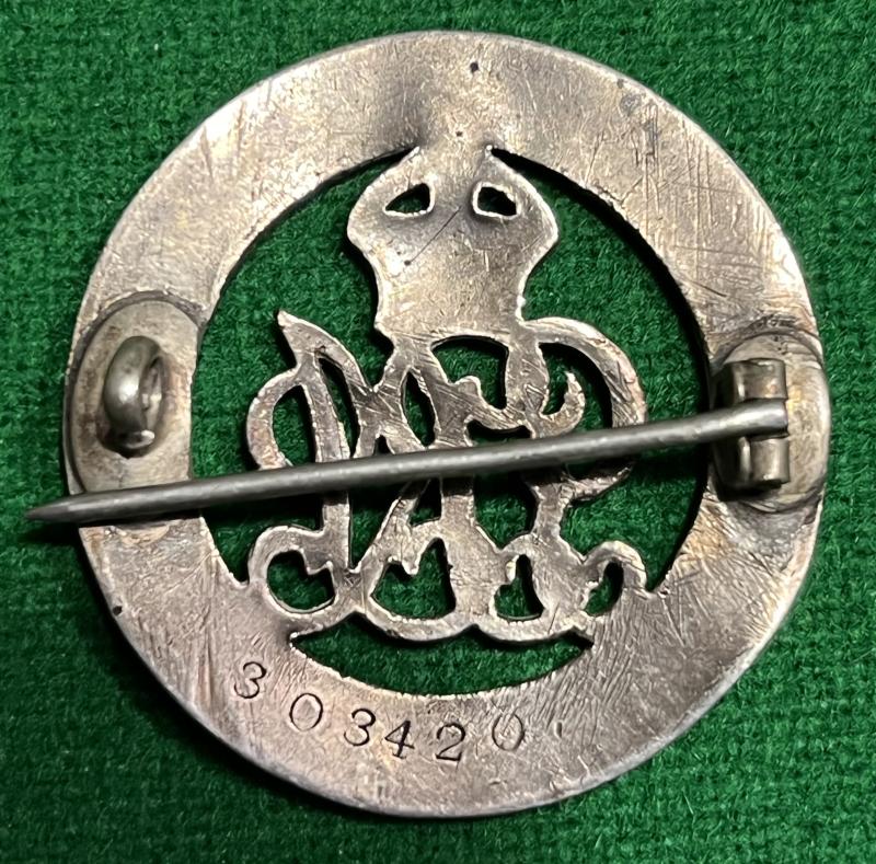 WW1 British silver wound badge numbered 303420 indicating issue to Pte.Harry Owen of the Leicestershire Regt. Good, lightly patinated condition with contemporary replacement pin and clasp.