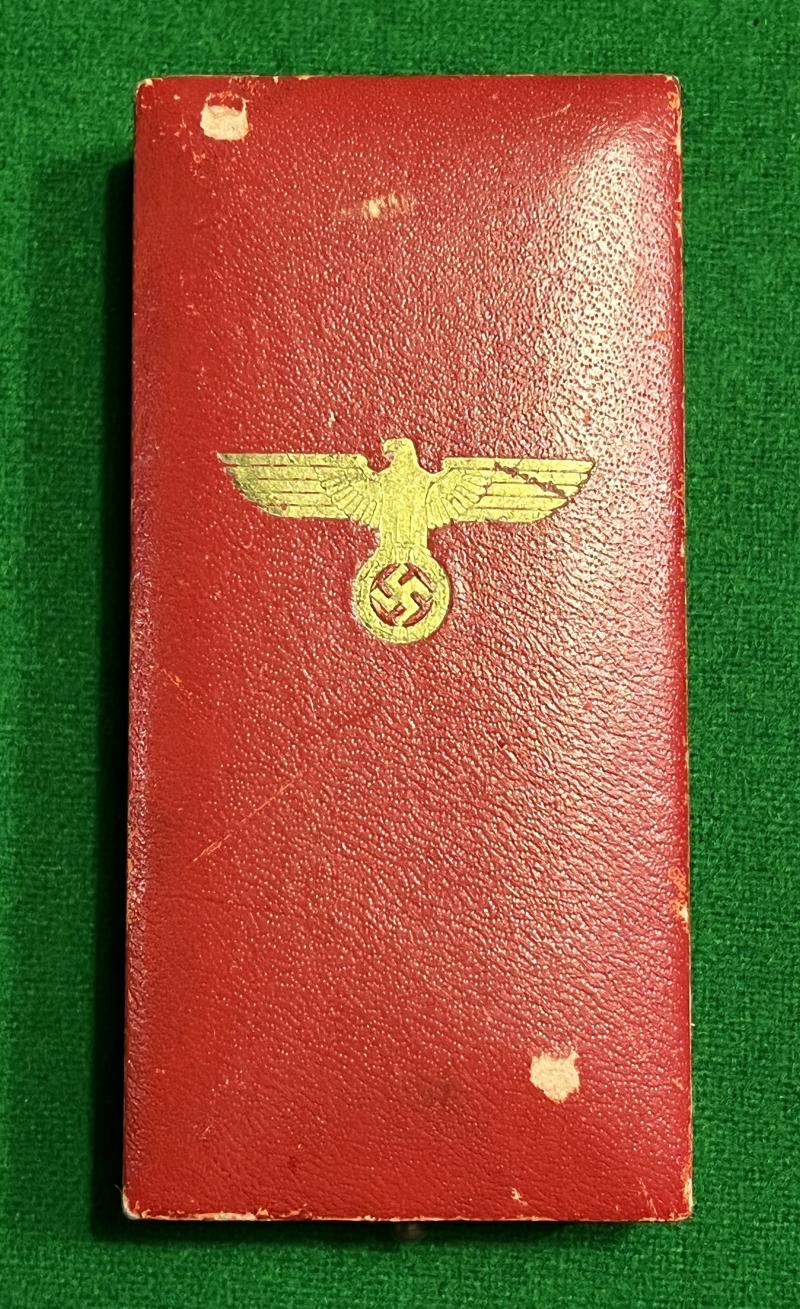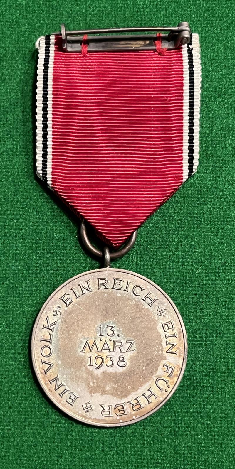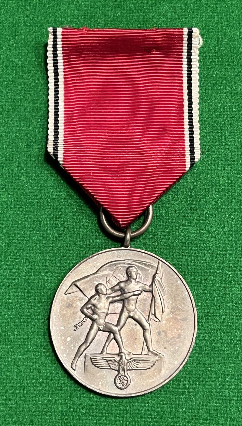 The Anschluss Commemorative Medal (or Die Medaille zur Erinnerung an den 13. März 1938 in German) was a decoration of Nazi Germany instituted on 1 May 1938 . This example in original case of issue with ribbon with original clasp fitting. Medal with some toning, case with some scuffs.