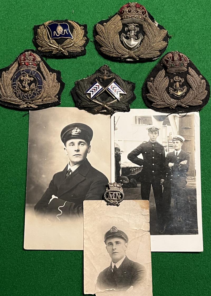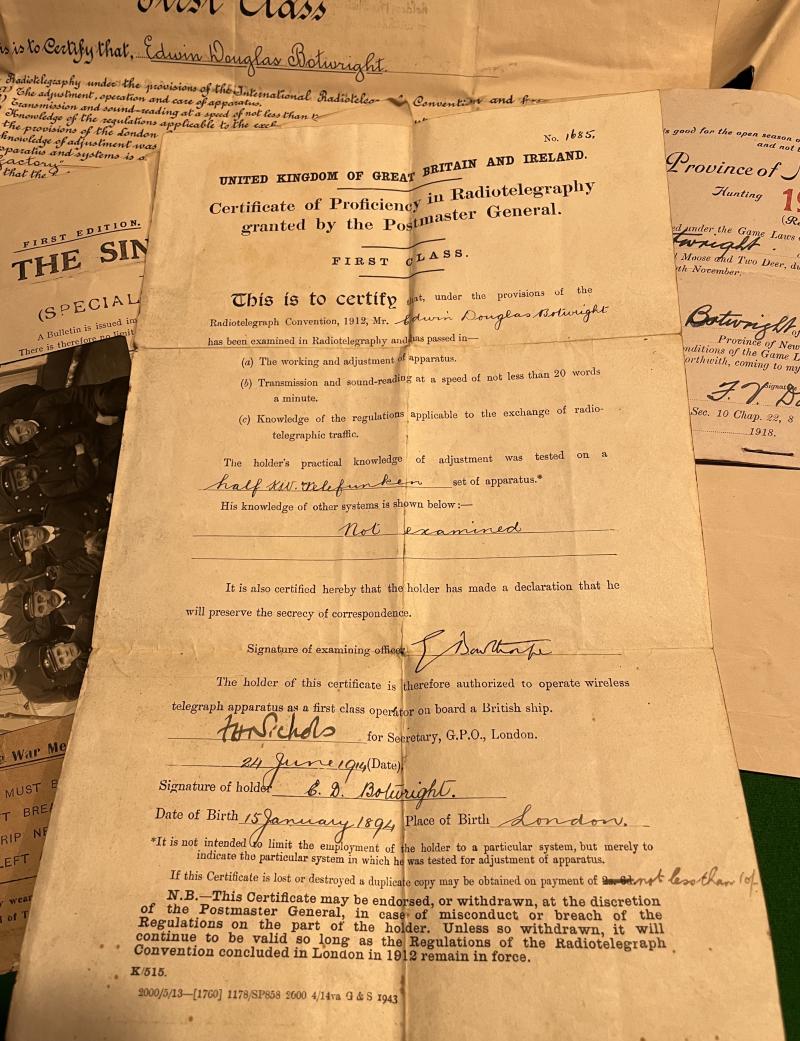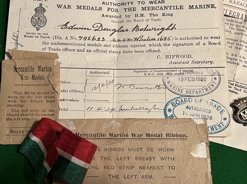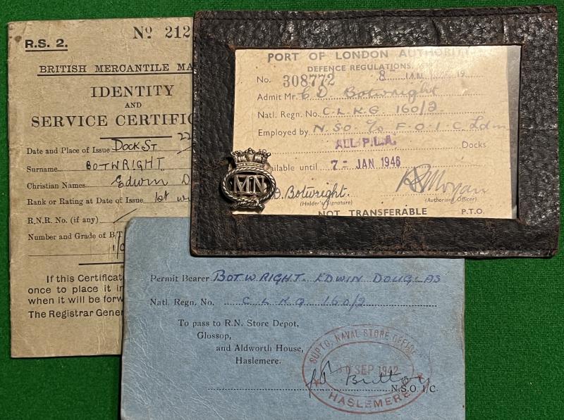 Interesting WW1 and WW2 Merchant Navy mixed grouping to a W/T Officer, E.D.Botwright. Consisting of bullion badges to the various shipping lines, Merchant Navy and R.N.Transport, passes, qualifications, certificates, photographs and Merchant Marine War Medal ribbon, envelopes etc. Botwright spent a long career at sea and during WW2 was based in the Port of London working with Naval wireless. Interesting and less common aspect to wartime history with plenty of scope for further research.