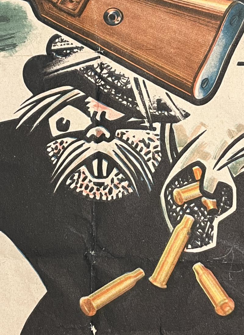 210mm x 295mm original Wehrmacht poster issued by the OKW. The subject of the poster is a judicious warning about spent ammunition and the value to the enemy as displayed by a popular caricature of the evil Marxist Russian. Good, used condition with some archival repairs to some tears with various chips and creases.