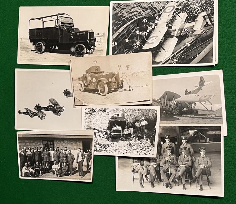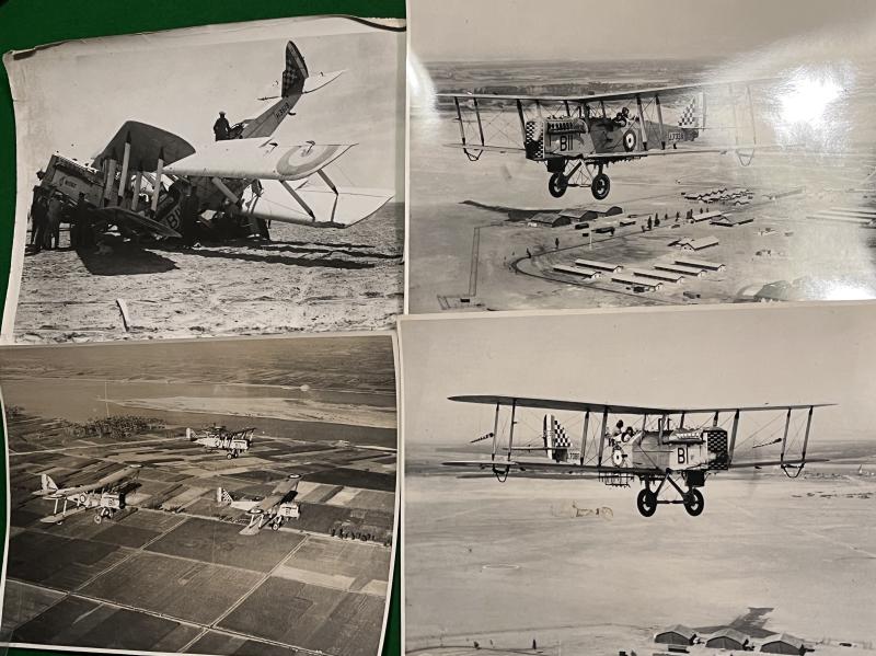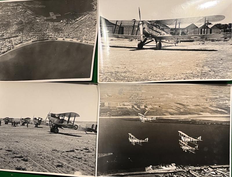 80+ b/w photographs that act as a record of an RAF serviceman's duty in the Middle East. Various formats from Brownie type prints to larger 8" x 6" images that start with early life in Manston in 1922 and move via ship to Egypt and Iraq. The images include personal shots of service life including vehicles with a large number showing various aircraft, DH9, Vimy, Fairey III, Hawker Hind, Blackburn Swift etc. These aircraft were