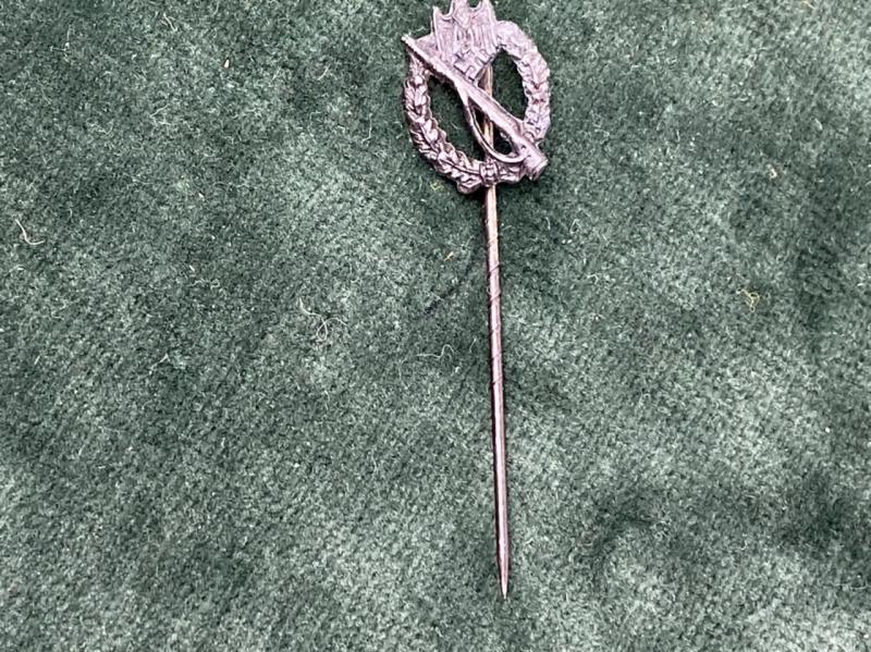 A nice miniature Infantry Assault stickpin for wear on civilian clothes etc. In near mint condition with original blackened finish. Excellent detail to badge. Nice knurled pin to reverse.