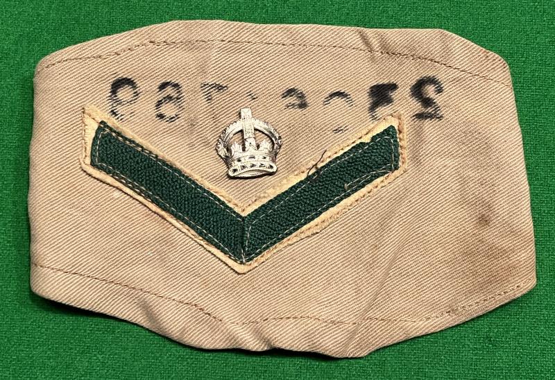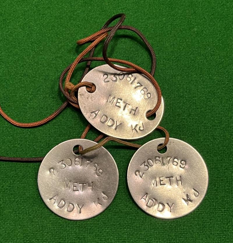 Grouping featuring two sets of stainless steel identity discs for a member of the Kings' Shropshire Light Infantry: 23061769 K.J.Addy whose religion is given as methodist. Late war/early post war period without blood group indicator. Also includes a rank armlet with Addy's number to the reverse, K.S.L.I. cap badge and white metal shoulder title.