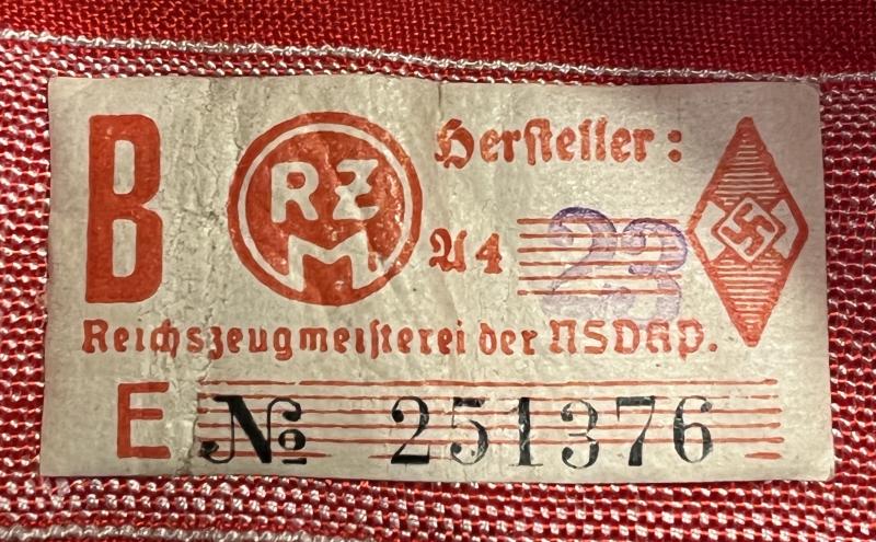An excellent example of an HJ armband. Multi-piece construction with a applied BeVo weave swastika with RZM label present to the interior. Minor storage marks.