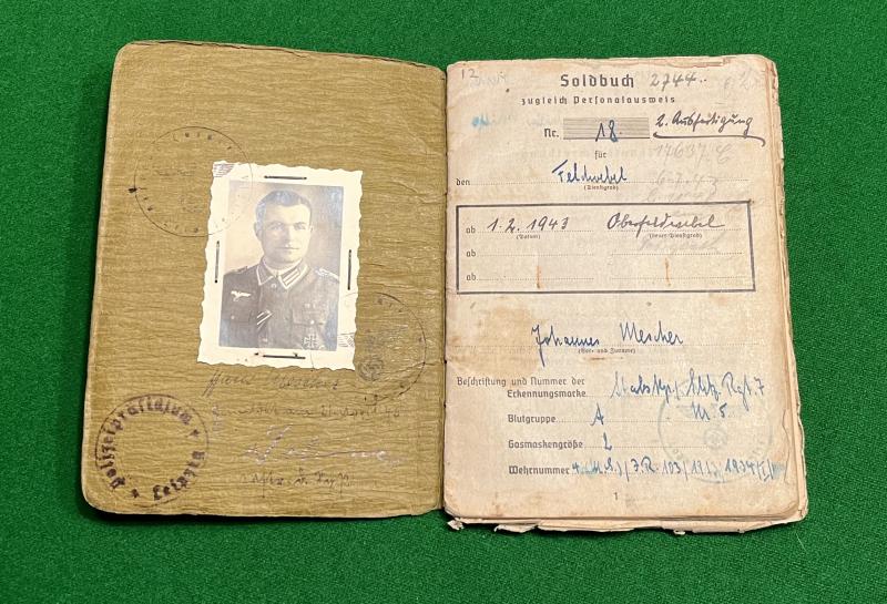 Mescher was a much decorated veteran with EKII, EKI, Black and Silver Wound badges, Panzer Assault, Sports badge, Westwall medal and 4 Year service medal. In 1942 he suffered a gunshot wound and then over a year later whilst fighting at Kursk was wounded by a shell splinter which necessitated the amputation of his leg. Orders were sent to the hospital ( included ) informing him of the award of the EKI. This second issue Soldbuch is profusely filled in with a photograph wearing awards to the opening page. Police stamp and date, 21/04/45, to the same page indicates that he had returned, presumably , to his home in Leipzig. Good example.