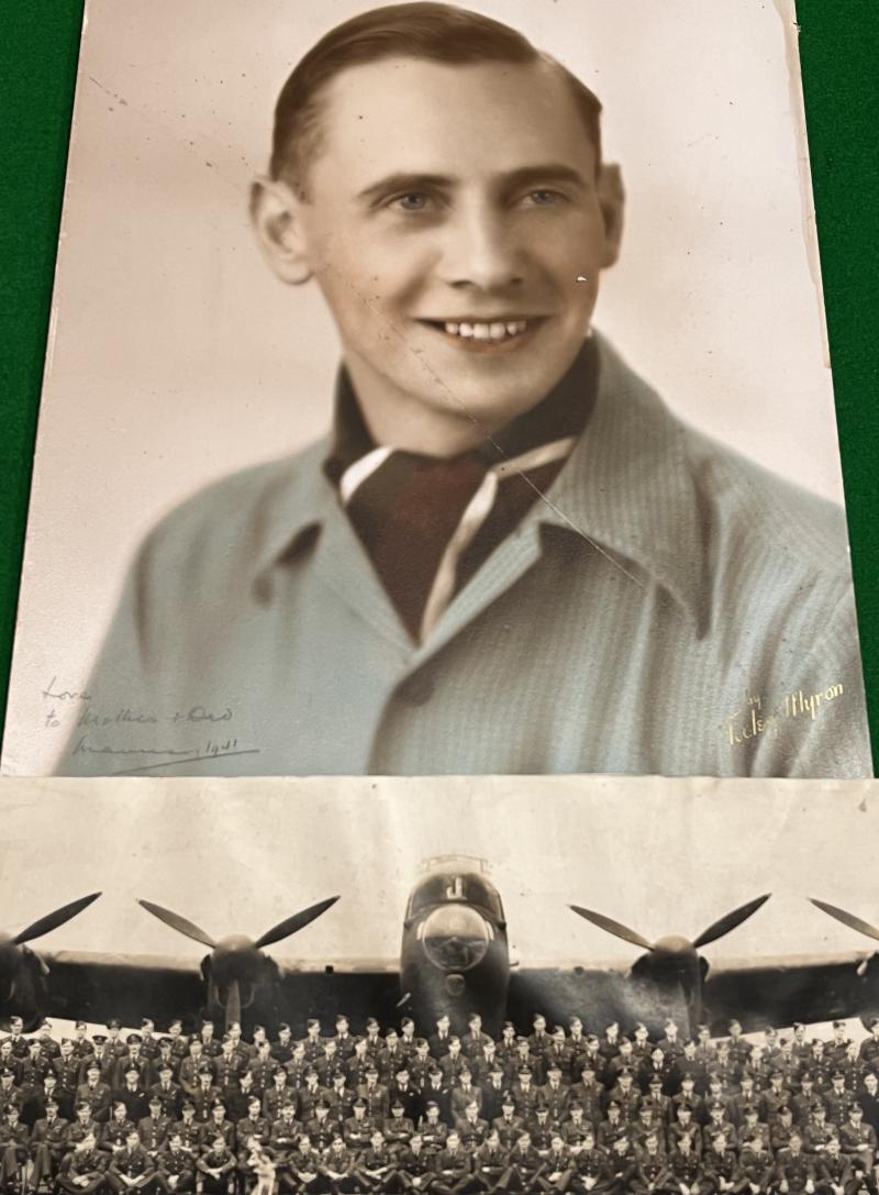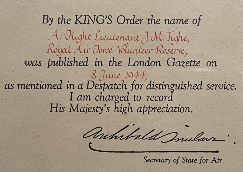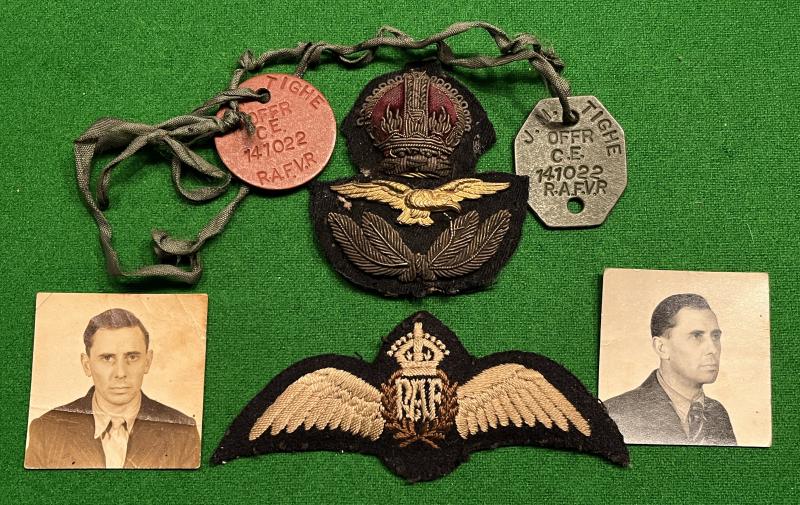 Grouping of medals, paperwork, photographs and insignia to F/Lt., later S/Ldr. J.M.Tighe. 39/45, Aircrew Europe stars, Defence and War medals with MiD oak leaf amateurishly mounted as worn along with various medal bars. Officer's cap badge, padded pilot's wings, complete set of uniform buttons, with a pair of cut-off uniform sleeves baring S/Ldr. rank. Various photographs including those taken for use with escape papers, overseas training, squadron photo with Lancaster and a small album containing various pre and post War family photographs. Framed MiD certificate and original dogtags included. Unresearched.