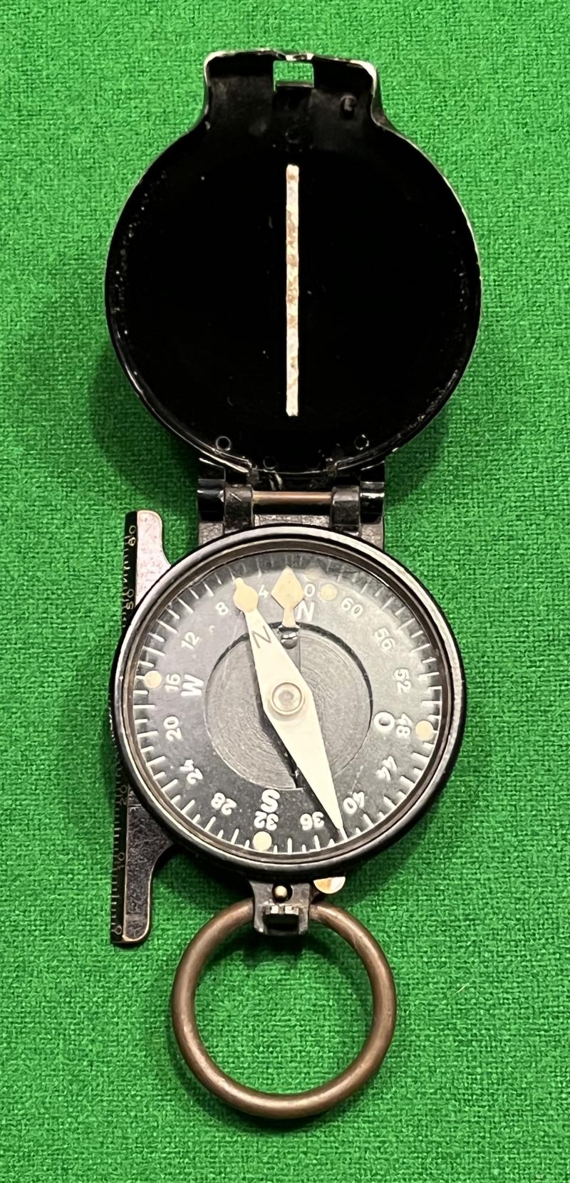 A good example of a WW2 German Marching Compass, constructed of alloy with a blackened finish. The Compass opens to reveal the compass rose with a blade sight and integral needle lock. Manufacturer marked and numbered to cover . Fold out centimetre scale to the base with brass lanyard ring. Good working condition.