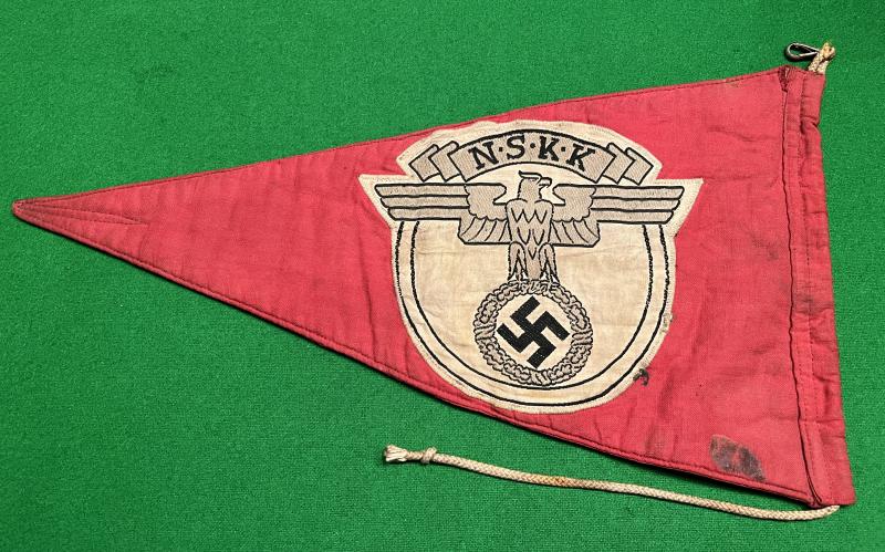 Multi-piece construction pennant for use by the NSKK. 19cms x 36cms approx. with mounting clip and cord. BeVo construction emblems mounted onto thick cotton and then joined with reinforcing stitching. Good, used condition with some marking.