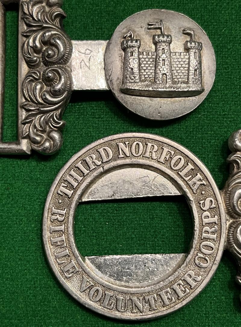 Silvered, O/R's waist belt clasp for a member of the Third Norfolk Rifle Volunteers. Matching numbered two-piece buckle in excellent, clean condition with light patination.