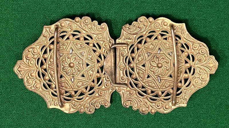 Gilt Lady's levee belt buckle featuring gilt filigree two piece buckles mounted with silver gilt Royal Artillery devices. Worn on a brocade belt by Ladies on mess nights. Good, slightly dulled condition.
