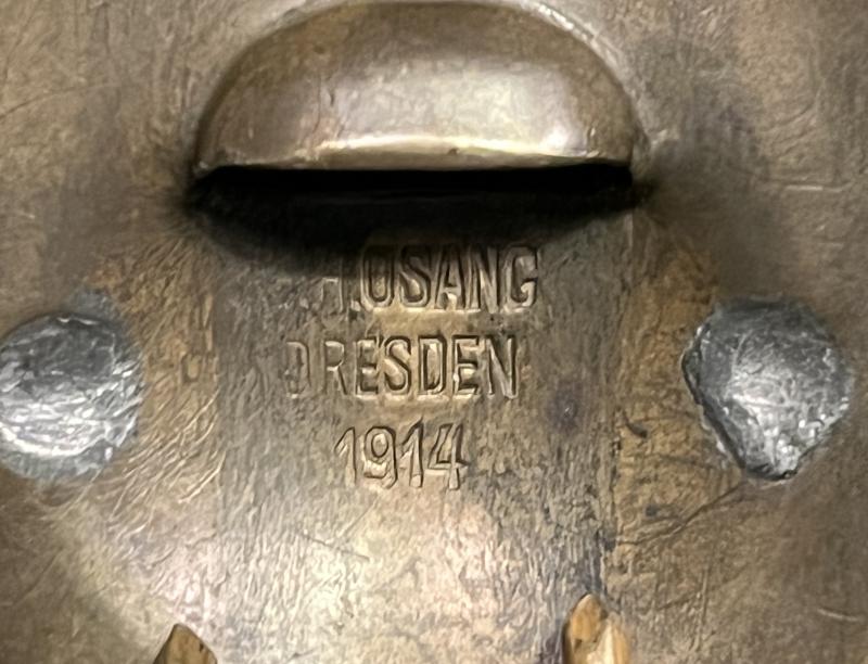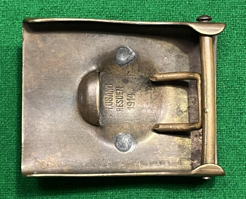 Brass WW1 Saxon belt buckle with die struck white metal central crown and motto. Clearly manufacturer marked ' G.H.Osang, Dresden ' and dated 1914 to the reverse.