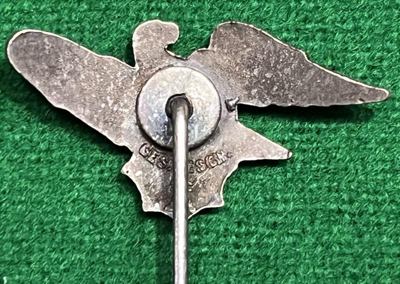 Neusilber stickpin for wear by members of the Reichluftschützbund in civil attire. 30mm wingspan mounted onto a 50mm knurled pin. Marked ' Ges.Gesch ' to reverse along with manufacturer's markings indicating manufacture by Hermann Aurich - Dresden. good, clean condition, patinated reverse.