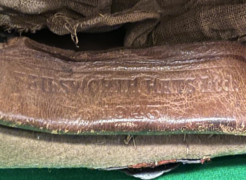 Standard British bush hat by Failsworth Hats Ltd., size 7 1/8, dated 1943 sporting the insignia of the Royal Engineers. Stitched RE flash overlaid with an economy plastic RE badge. Manufacturer marked and dated to leather headband with inspection marks to reverse of band. Interior with partial cotton liner with residual remains of a silver foil crown, now absent. Hat very much ' as found ' with some surface staining, dusty etc with some minor moth nips. RE ribbon appears to be mother behind the badge. Good, used example.