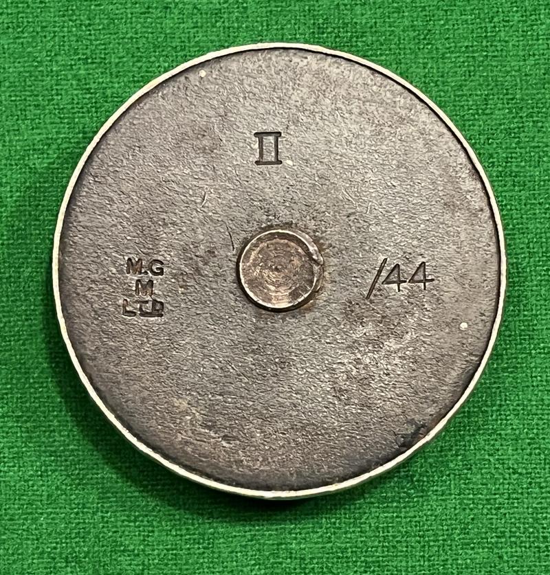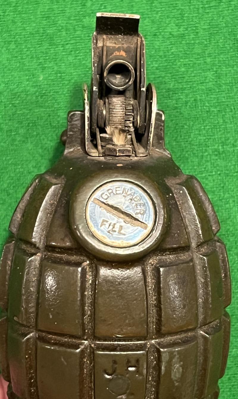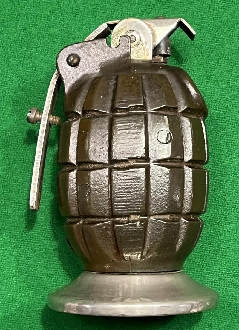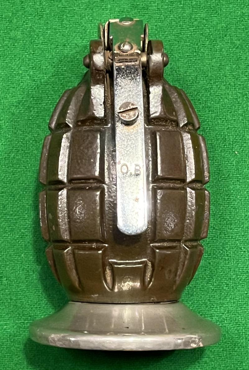 The must have accessory for every grenade collector ' The " Grenader " Table Lighter by Poparts, London. Featuring a No.36 body marked ' JH ' which had been drilled to be a Drill grenade, then plugged and then mounted onto an original MkII 1944 gas check plate which in turn has been shrouded with a chromed sleeve. Depressing the ' O.B. ' marked, chromed lever sets the lighter which has been mounted in place of the striker. Fuel is added by unscrewing the original base plug and pouring into the internal wadding. The ' Grenader ' brand name impressed to chrome filling plug. All appears to be in good working order with grenade finished in it's original lacquered finish.