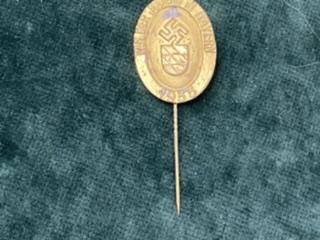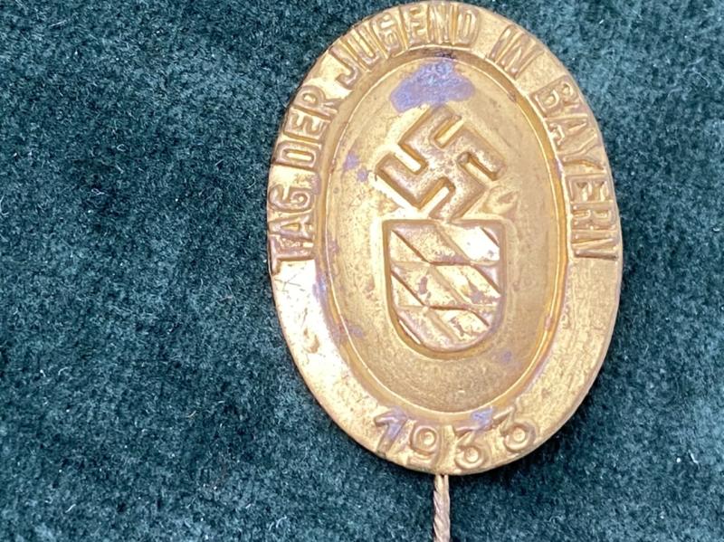 This is a very early pin for probably a Hitler Youth event in Bayern in 1933. Small oval gilded metal badge with pin. Has the Bayern cost of arms in the centre with a swastika above. Tag der Jugen (Youth) in Bayern around the edge.