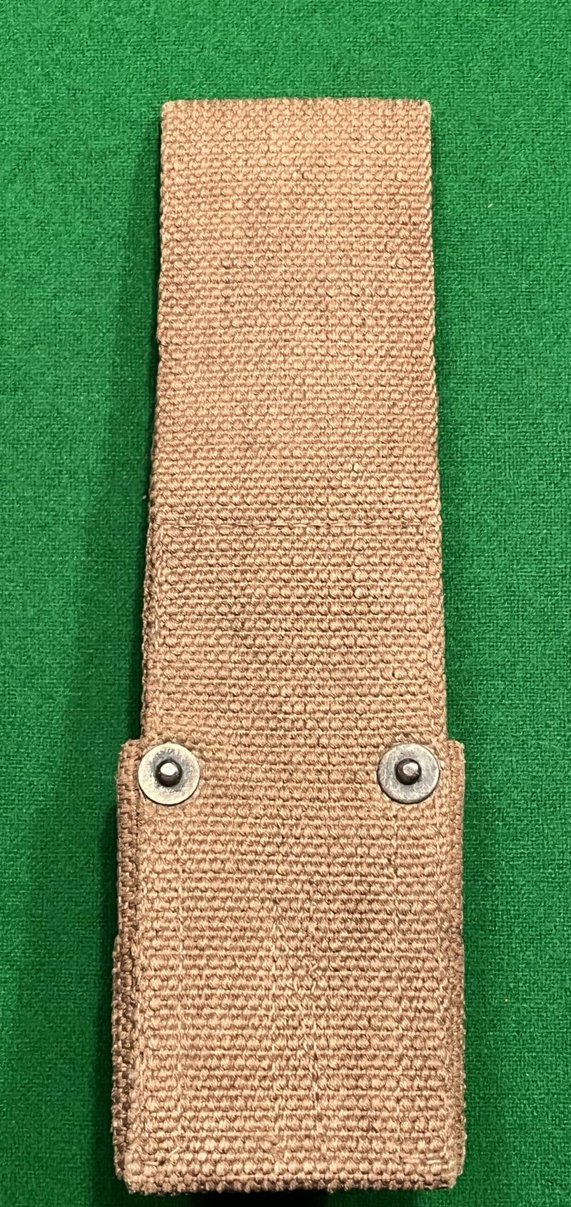 1st Patt '08 Patt Bayonet Frog indicated by the reinforcing rivets and lack of tab. This example is the slightly narrower pattern ( SEE no.124 Carter Bayonet Belt Frogs ) with the reinforcing rivets secured by washers. Good, clean condition with no visible markings.