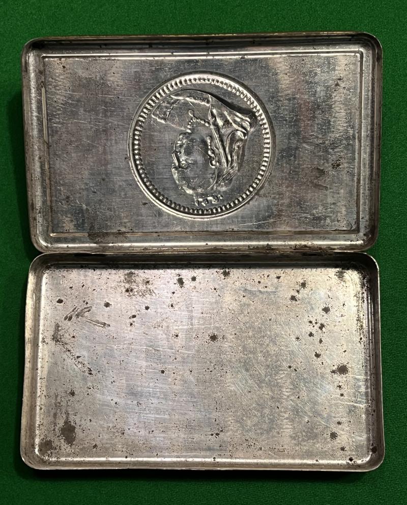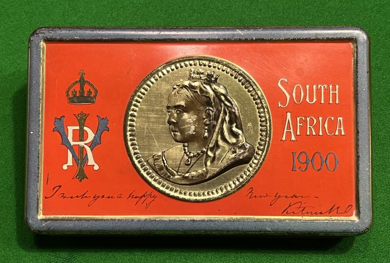Queen Victoria concerned about the morale of her army and navy, wanted to do something to lift their spirits. She had heard that officers had gained much pleasure in receiving gifts from home so she decided she would send chocolate, a luxury item to the majority of people in those days. She would send chocolate to all of her army and navy serving in South Africa (including Australian contingents) as a Christmas/New Year gift in 1899/1900. Three manufacturers were contracted, Cadbury's, Rowntree and Fry to complete the order. This tin I believe was one produced for Fry. Excellent, used condition with bright colouring and some light rubbing to highlights, no contents !