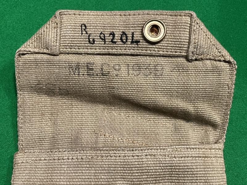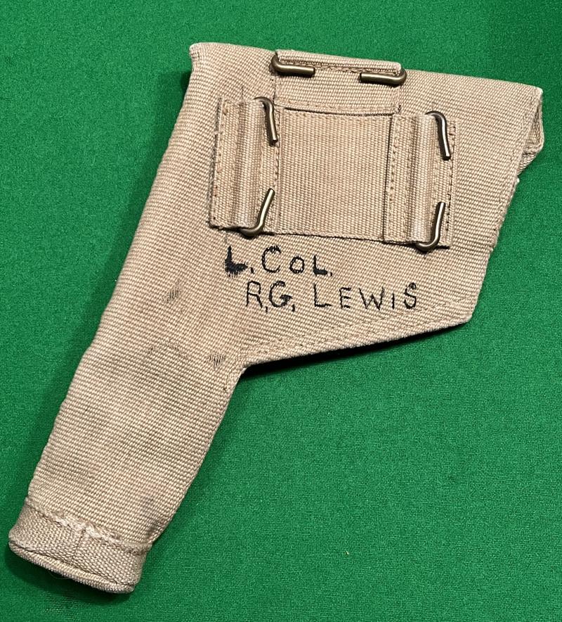 A good used '37 Patt pistol holster dated 1939 and produced by the Mills Equipment Company with clear stampings and inspection marks. Named to a Lt.Col.R.G.Lewis to the reverse with an identity number inked to the inside of the flap. Some light marking but otherwise excellent used condition.