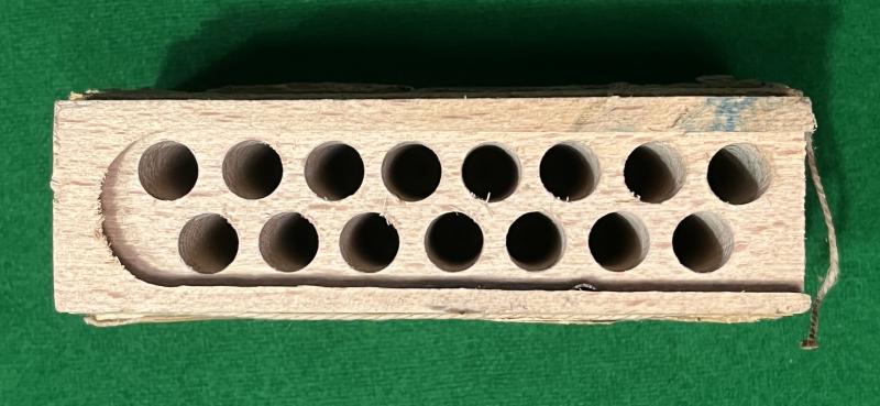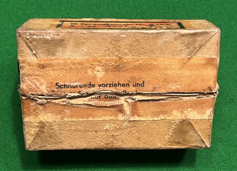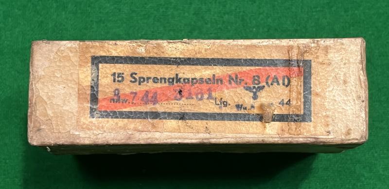 Wooden and card container for 15 ' Sprengkapseln Nr.8 ( AI ) ' - detonators for the German stick grenade. Usually found in the steel or wooden stick grenade containers this example in excellent, used condition with clear labelling, indicating manufacture in 1944, complete with the ripping string used for opening and with it's original wax waterproofing. Carton's wooden interior in excellent, clean condition complete with slide off lid. Not easy to acquire in this condition.