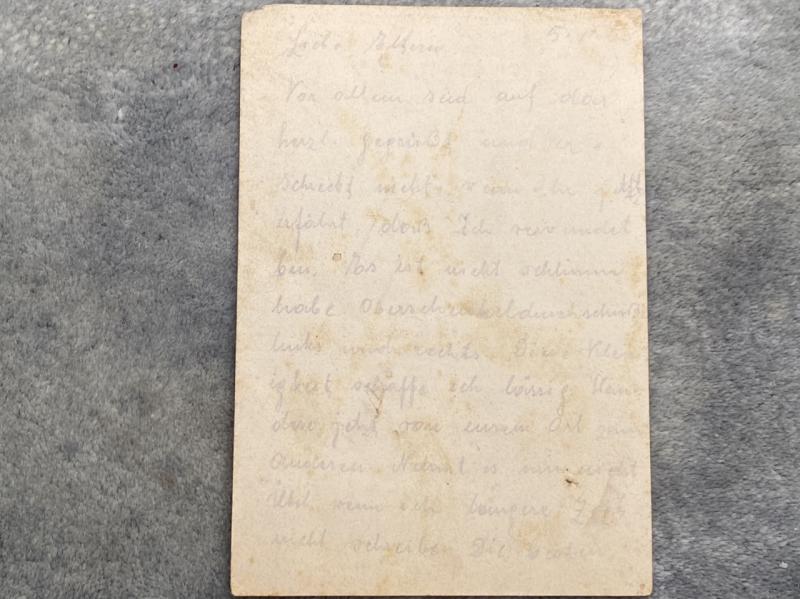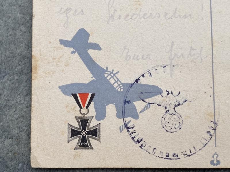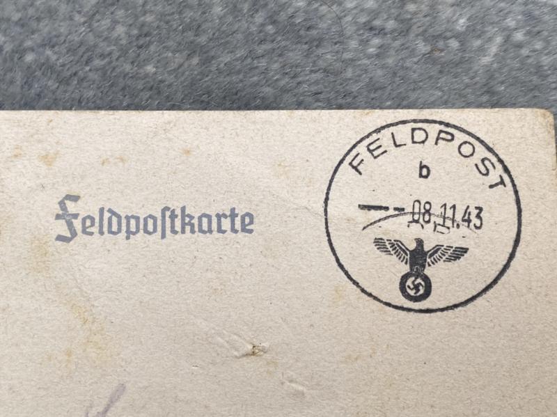 A most interesting original FELDPOSTKARTE sent in 1943 and fully completed in pencil on the reverese. The front features a good silhouette of a Stuka dove bomber in grey and an Iron Cross in colour. I can’t quite make out the address to where it was sent, but it has the postal franking date of 8.11.43 as well as the unit field censor stamp on the opposite side. If translated, it could be interesting (or not!)