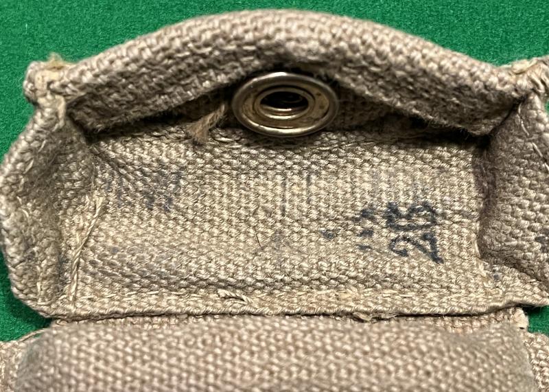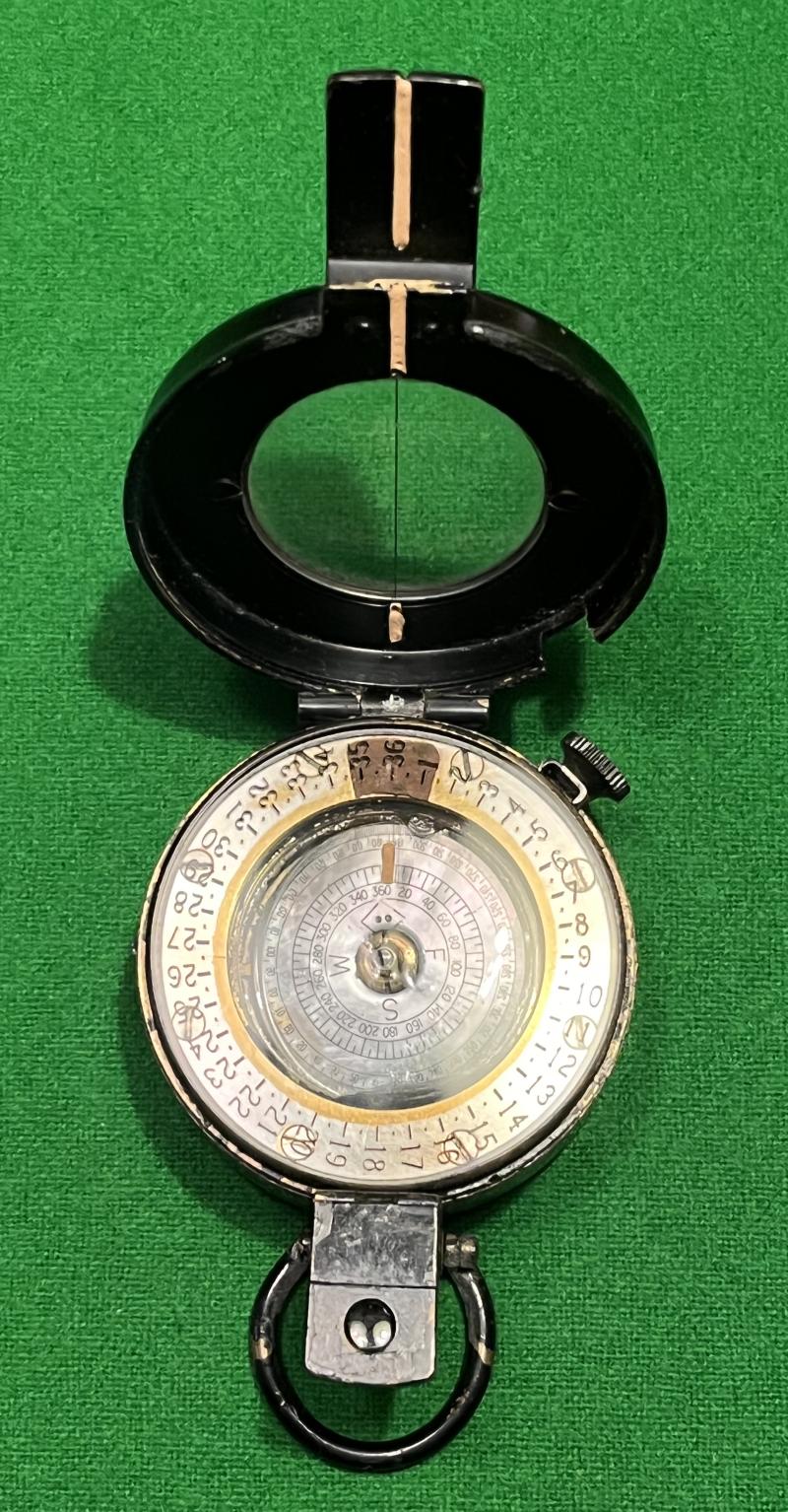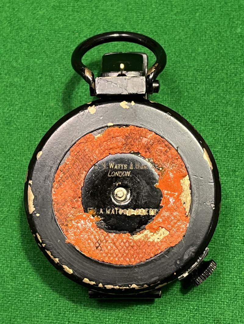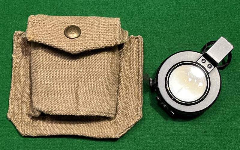 An undated British Mk.III marching compass with 1943 ( ? ) dated '37 Patt pouch. Maker marked ' E.R.Watts & Son, London ' also marked ' F.J.A.Watson-Baker to the reverse. In good working condition with clear covers and light wear to high points with heat distortion of the rubber anti-slip ring to the reverse. Some loss of alcohol filling. Good example accompanied by clean '37 Patt compass pouch.