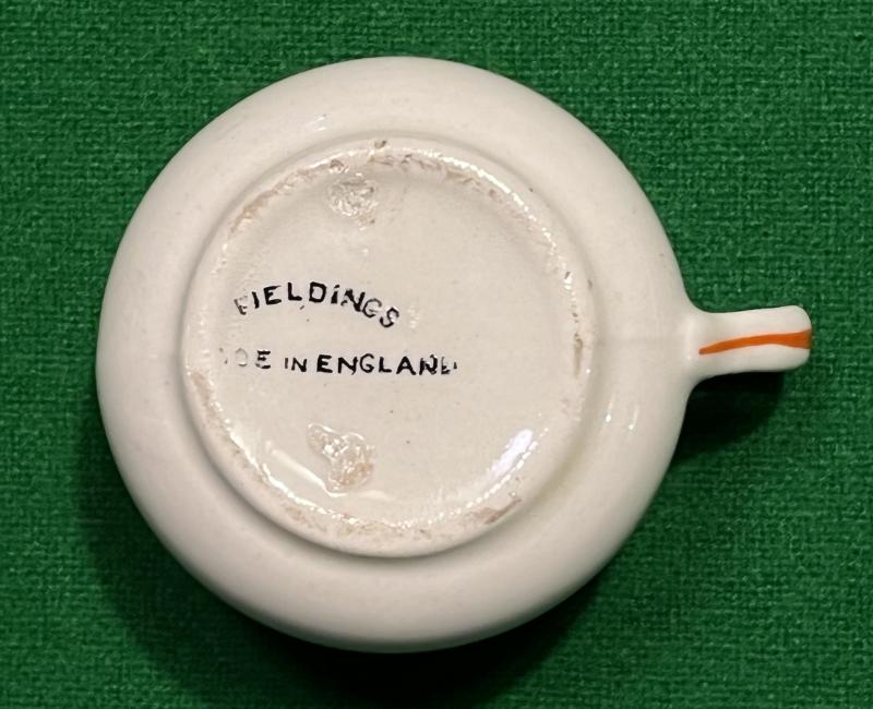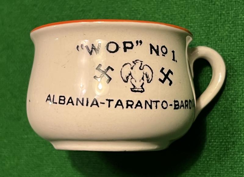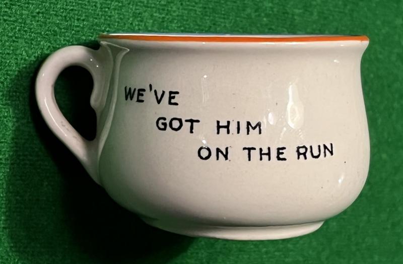 Comic ashtray in the form of a potty with Mussolini's face in the interior with the dedication ' Wop No.1' and ' We've got him on the run '. This Phoney War period novelty was one of a series showing notable Axis leaders and was manufactured by Fieldings. The examples featuring Mussolini are considerably more scarce than their counterparts showing Hitler. In good undamaged condition.