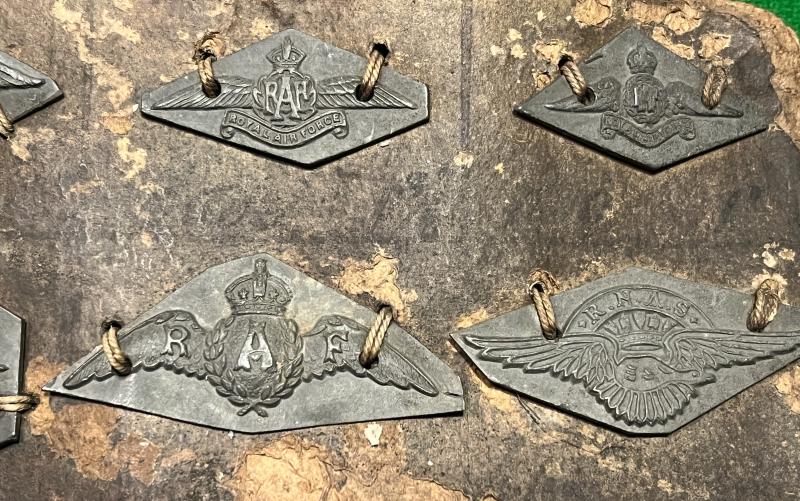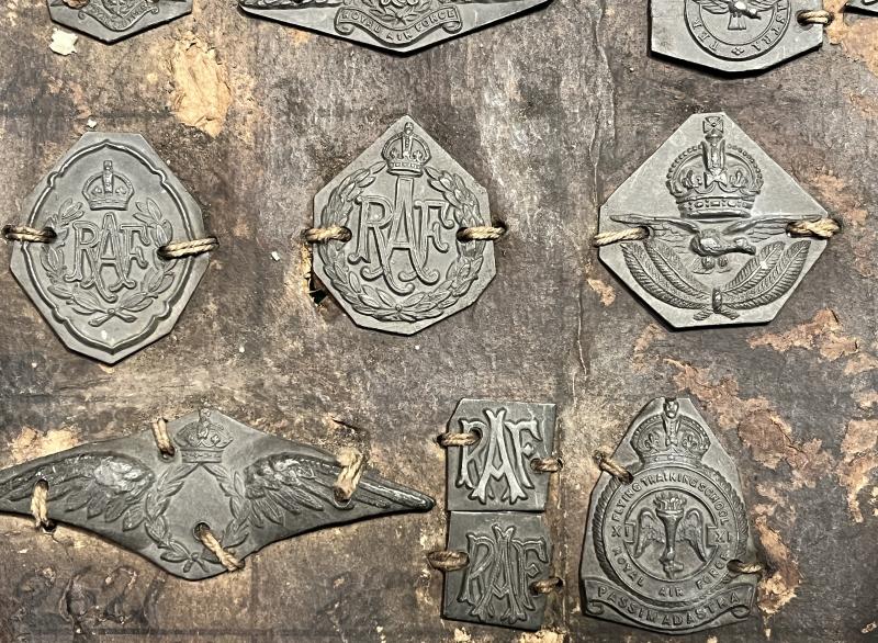 R.A.F/RNAS sweetheart badge die patterns mounted on card. Thought to have come from the well known manufacturer, Millers, this card shows a series of patterns used in the production of sweetheart badges, originally identified by ink numbers, now largely illegible. Interesting example of the variations available.