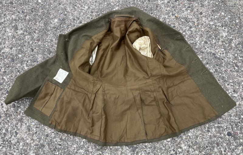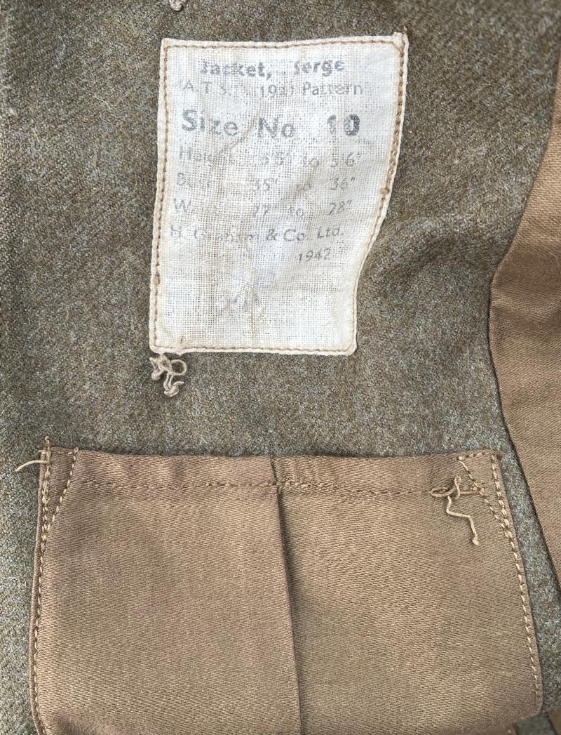 A 1941 Patt. tunic to a member of the women's Auxiliary Territorial Service. Integral waist belt, brass general service buttons, HQ 21st Army Group badges to both sleeves surmounted by brass ATS shoulder titles. Good conduct stripe to l/h sleeve with ATS lanyard to right shoulder Brass cap badge above chest pocket showing attachment to the Intelligence Corps with Defence and War medal ribbons below. 3/4 cotton lining. Manufacturer's label ' Jackets Serge A.T.S. 1941 Patt, size 10, Height 5 ft 6 inches, bust 35/6 and waist 27/8 inches, manufactured by H.Graham 1942. Excellent, clean condition with no sign of moth damage.