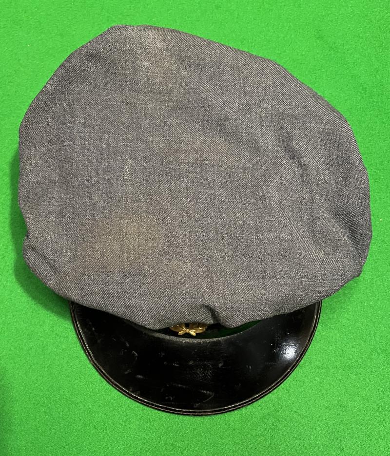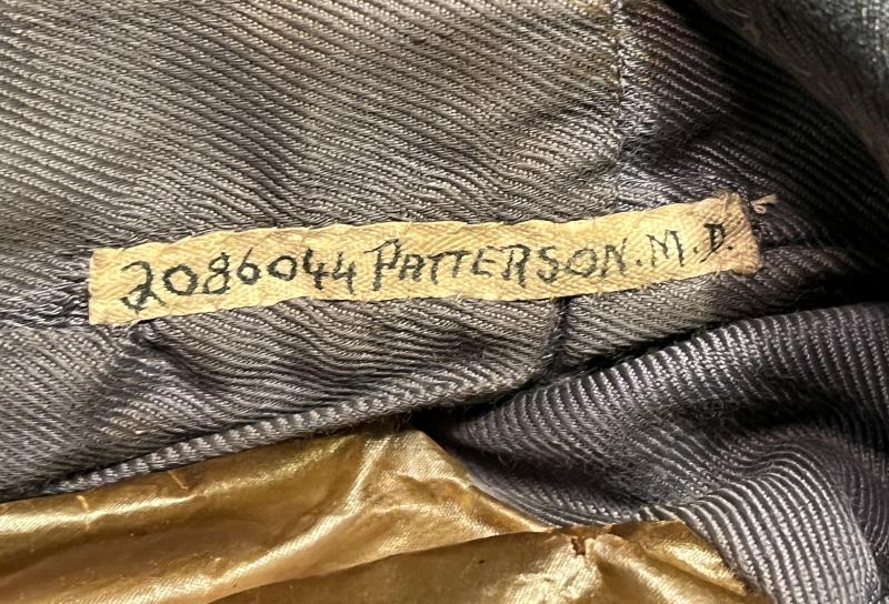 Based on the ATS pattern and seeing service throughout WW2 this is an example worn by o/rs and ncos. It features a blue grey wool body, black patent leather peak with green underside and a rayon lining with integral oilcloth protector. A black mohair band mounted with a brass King's crown RAF cap badge to centre with a black patent chin strap below. Manufacturer's details ' J.Collett Ltd ', date:1941, and size:7 are seen beneath the translucent oil cloth protector. Name tag tacked to liner with name and number repeated in ink to underside of peak. Excellent, clean, used example.