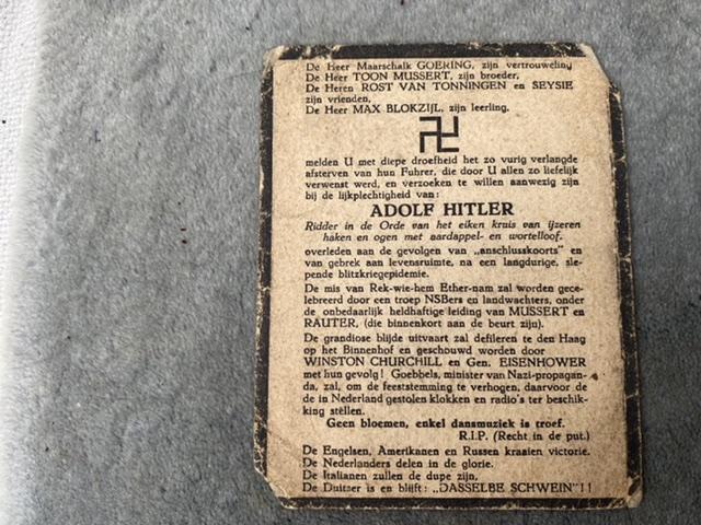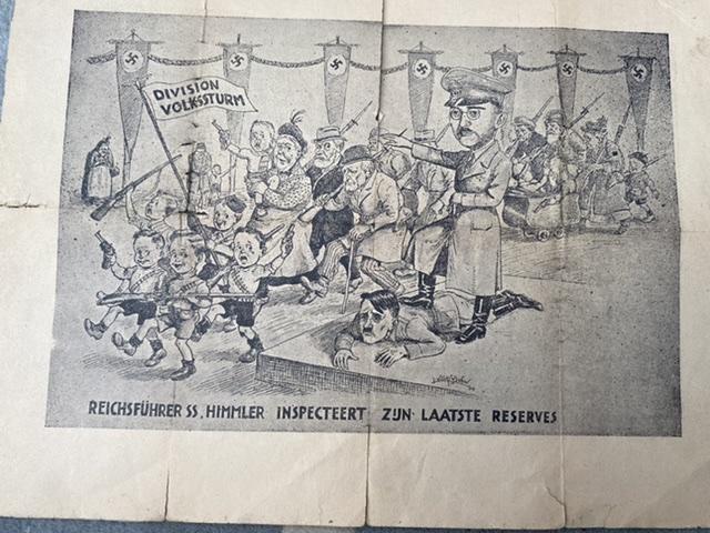 All from a recent acquisition. There were 7 items of war-time paperwork, all bought back by a British soldier from Holland/France. The most interesting is the August 16 1940 edition of the Daily Mirror! However, the items consist of a ‘drop leaflet’ depicting Himmler inspecting his ‘last reserves’ which consist of women, children and old people. It’s in Dutch so was dropped on the population at the time. It’s dated 1944. It is complete but has been folded many times over the years so is a little fragile. There is also a ‘Death of Hitler’ two sided propaganda card. Picture of Hitler on the front and then on the rear is the comic description of the death of Hitler. There are two pieces of paper occupation money, a 1938 dated 1 Gilder note and a 1936 dated French 100 franc note.