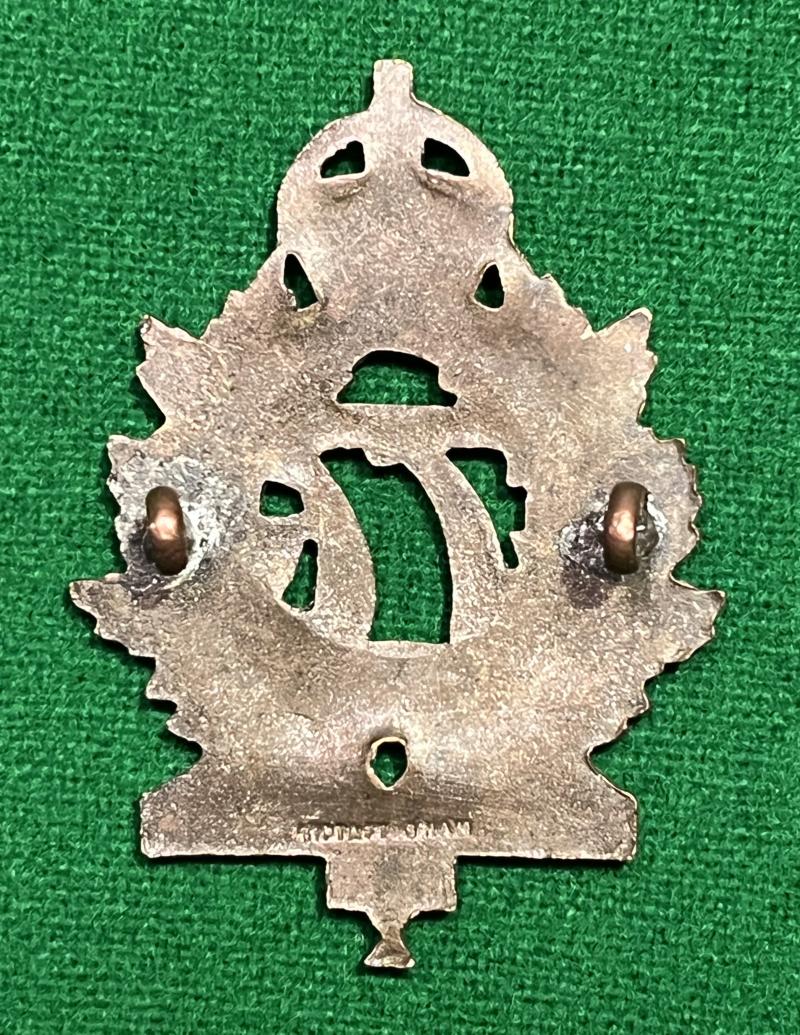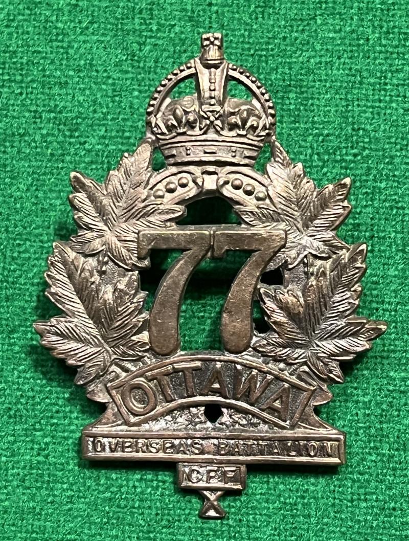 WW1 O/Rs voided pattern cap badge to the 77th Battalion CEF. Die struck with Birmingham manufacturer's details to the reverse. Good, clean and crisp example.
