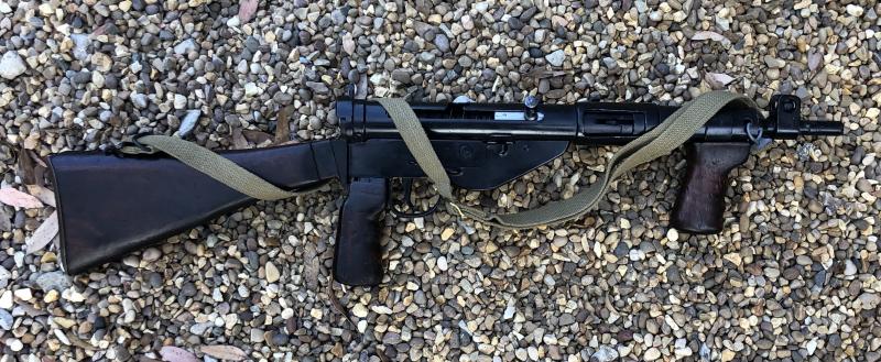 Early production WWII Sten MKV manufactured by ROF - Royal Ordnance Factory Theale/Fazakerley stamped ' M78 '. Pre-December 1944 production. The MKV was first introduced in early 1944, and is essentially a better quality version of the MK2, using the same magazine port and body, magazine and similar bolt assembly. New additions were, wooden stock, pistol grip, No4 foresight and a wooden vertic... read more