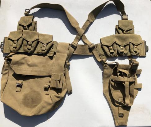 A webbing set, displaying an intentional mixture of Patt. '19 and Patt. '25 web equipment showing the marks of the Mills Equipment Company and mostly dated 1927 and 1926. This set consists of Patt. '25 Cartridge carriers, Back adjustment strap, Bayonet frog, Braces, Haversack, together with a Patt. '19 Rifle Equipment Entrenching tool carrier and Water bottle carrier, all in khaki. According t... read more
