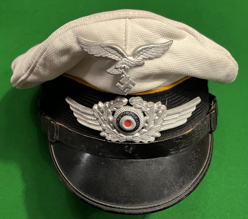 A good example of a WW2 British Wiltshire Regt. officer's cap. Fine serge body with leather strap retained by bronzed GS buttons with bronze cap badge to front. Lined interior with intact protector over a prominent Burberrys label. Roam leather headband with a plush forehead protector. Approx. size 7 1/4. Excellent, used condition. read more